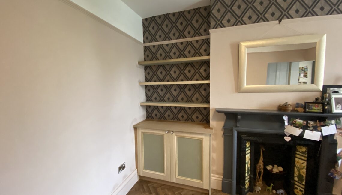 The client wanted a fitted alcove cabinet with three floating shelves above the chimney breast. The design needed to feel balanced and sit naturally within the existing recess.