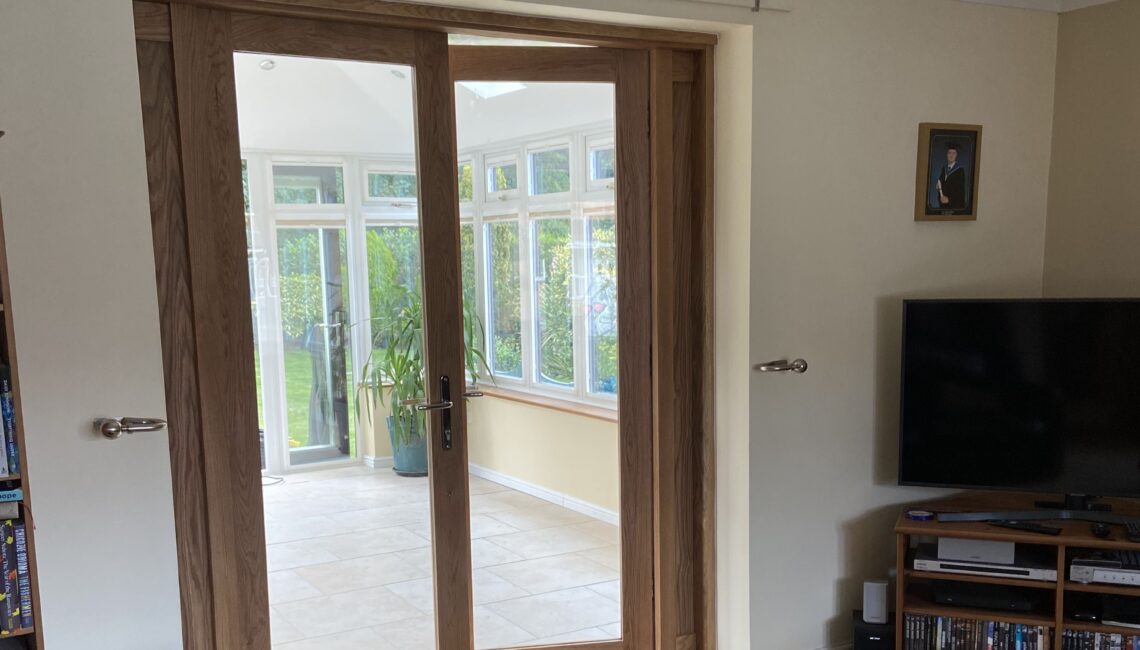 We manufactured the replacement doors from solid oak and added narrow side screens to increase the glazed area. As a result, more natural light now flows between the living room and conservatory while the strength of solid timber joinery is maintained.
